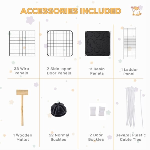 - • This guinea pig cage comes with 33 wire panels, 2 side-open door panels, 11 resin panels and a ladder